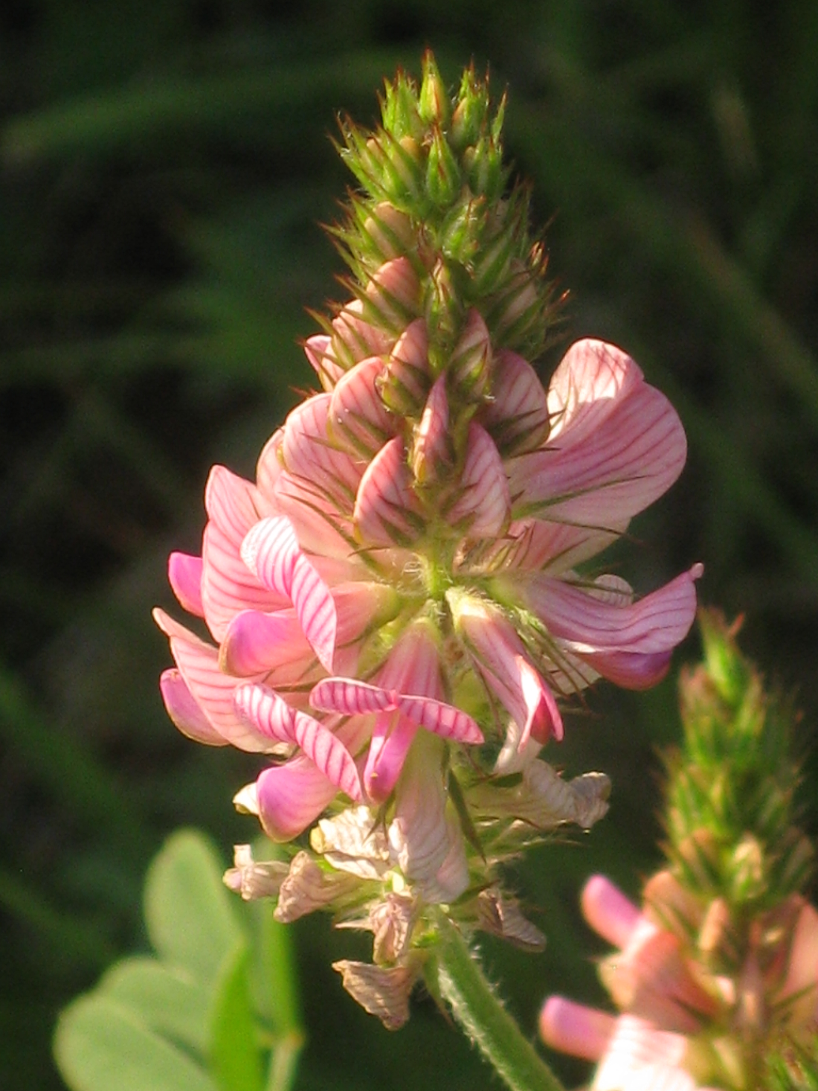 30-70(-90) cm. Stg aufrecht. Blätter mit (5-)6-12(-14) Fiederpaaren. Blättchen (10-)15-25(-35) mm lg u. (3-)4-7(-9) mm br. Blütentraube vor dem Aufblühen eilängl., dick, an der Spitze abgerundet, dichtblütig, zur Blütezeit 1,5-3 cm br. Blütenstiele 1 mm lg. Tragblätter 3,5-4 mm lg, wenig kürzer als der Kelch. Krone (8-)10-14 mm lg, rosa. Fahne etwa so lg wie das Schiffchen. Flügel 3-4 mm lg, stumpf, kürzer als der Kelch. Hülsen 6-8 mm lg, am Kamm mit 6-8 dicken, bis 1 mm lgn Stacheln. |